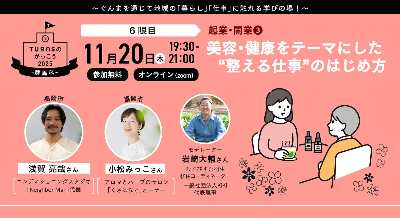 【11/20(木) 19:30〜オンライン】 \起業・開業③/ 美容・健康をテーマにした “整える仕事” のはじめ方 〜TURNSのがっこう群馬科2025・6限目〜