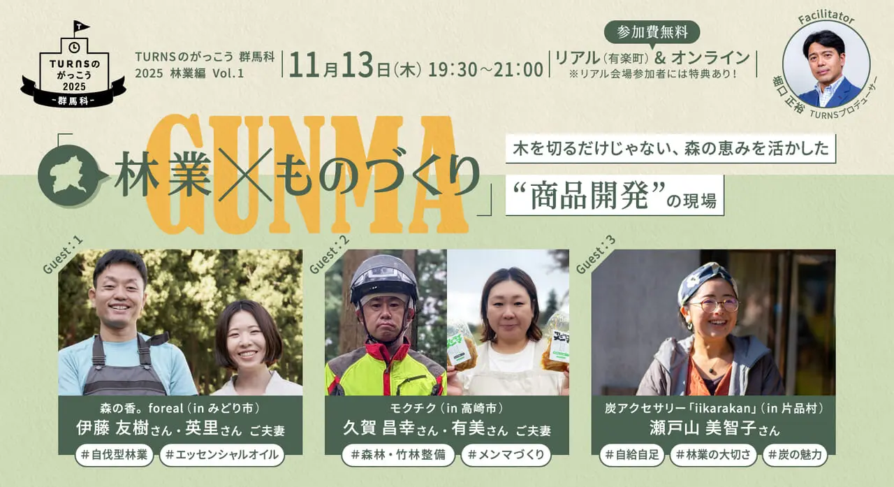 TURNSのがっこう 群馬科2025 林業編 Vol.1 テーマ:「林業×ものづくり」──木を切るだけじゃない、森の恵みを活かした “商品開発” の現場 林業の担い手不足が全国的な課題となる中、群馬県...