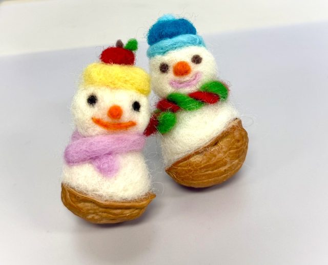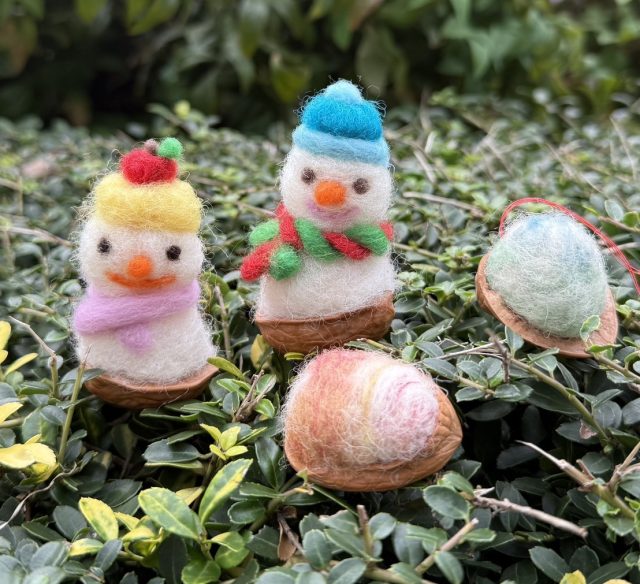 今回は専用の針を使ったニードルフェルトと言う手法で作った「羊毛雪だるま」を県内で生産された胡桃の殻に入れてオーナメントに仕上げます。