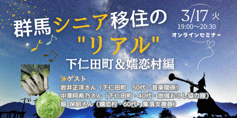 当日は、下仁田町や嬬恋村に移住した方々が、移住の経緯や仕事、住まいのほか、地域の人との交流など「シニアに寄り添った移住成功の秘訣」について語ってくださいます。