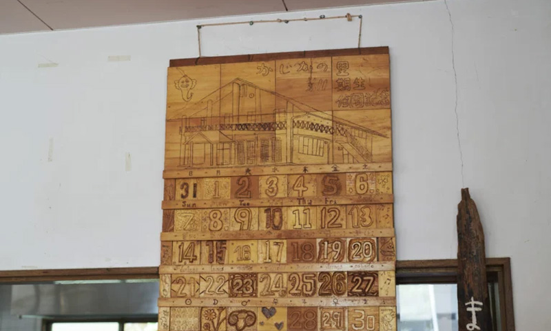 食堂に飾られているのは、子どもたちが卒業制作でつくった木彫りのカレンダー。
