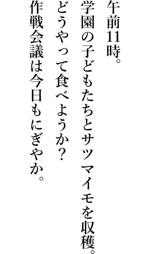 学園の畑で子どもたちと育てたナスやジャガイモで料理をし、みんなで食べるのも楽しみの一つ。庭ではニワトリを飼っていて、この間ヒヨコが生まれたので、子どもたちと世話をしています。かわいいですよ。