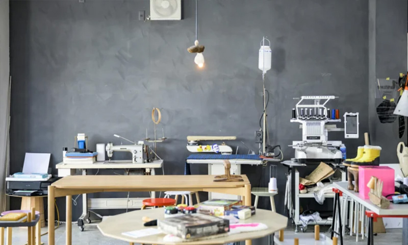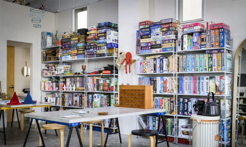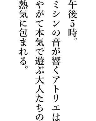 ボードゲームに興じる人々のすぐ傍らで、ミシンがリズムを刻む。賑やかな笑い声と、ものづくりに向き合う真剣な空気が、ひとつの空間に溶け合う。