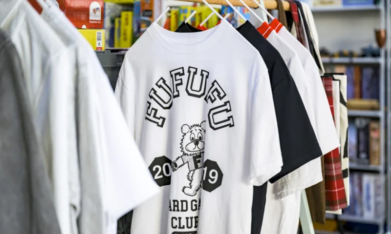 桐生をはじめ国産の繊維で仕立てたアパレルやオリジナルTシャツも並ぶ。
